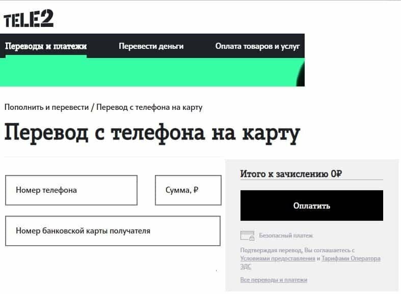 Перевод денег через сайт Tele2